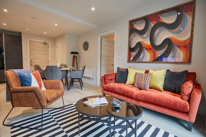 Light and spacious with floor to ceiling windows and curtains. Plush three-seater sofa and lounge chair, media storage unit with 50 inch Samsung 4K smart TV and nested coffee tables with mirrored tops.