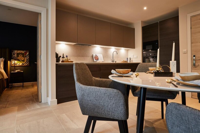 Open plan, sleek and modern with quartz worktops and integrated Samsung appliances including touch control ceramic induction hob, dual fan oven, microwave, separate stacked fridge and freezer, dishwasher plus washer/dryer. Room to entertain with marble effect dining table and four chairs.
