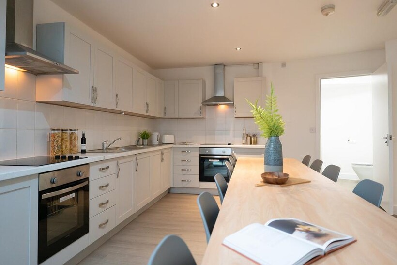 A stylishly renovated property offering 12 spacious double bedrooms, each furnished with a desk, chair and ample storage. There are four modern bathrooms for convenience.The living room includes large sofas and a flat-screen TV, plus a generously sized dining table for communal meals. The kitchen is fitted with contemporary appliances, multiple fridges and a washing machine. Included amenities encompass superfast broadband and all utility bills.