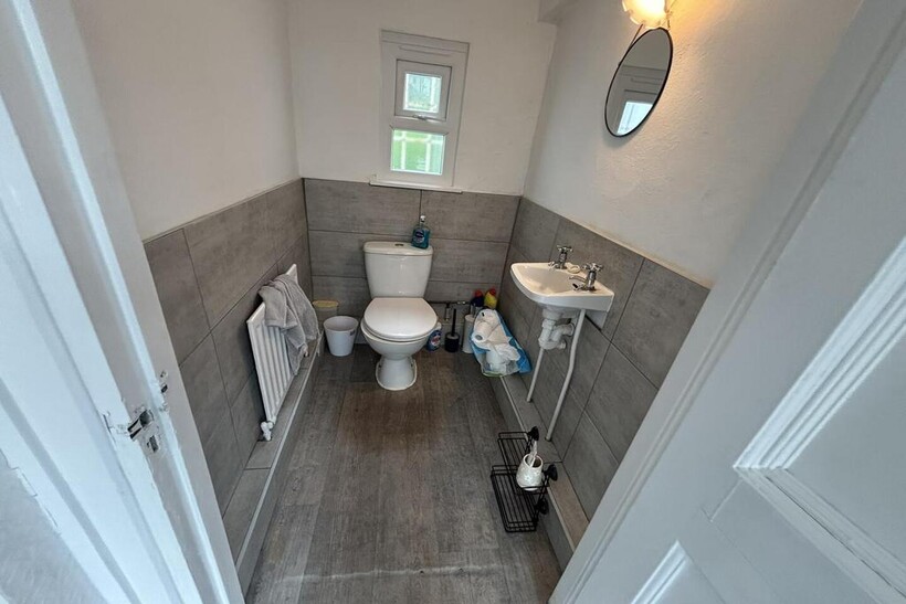 Cloakroom/Wc - Close coupled wc, wah hand basin, radiator, half tiled walls and laminate flooring.