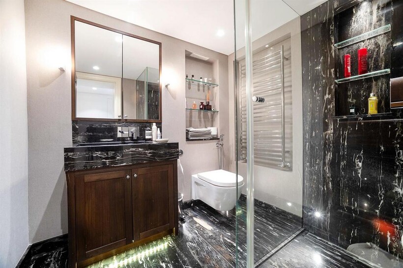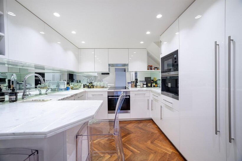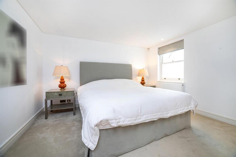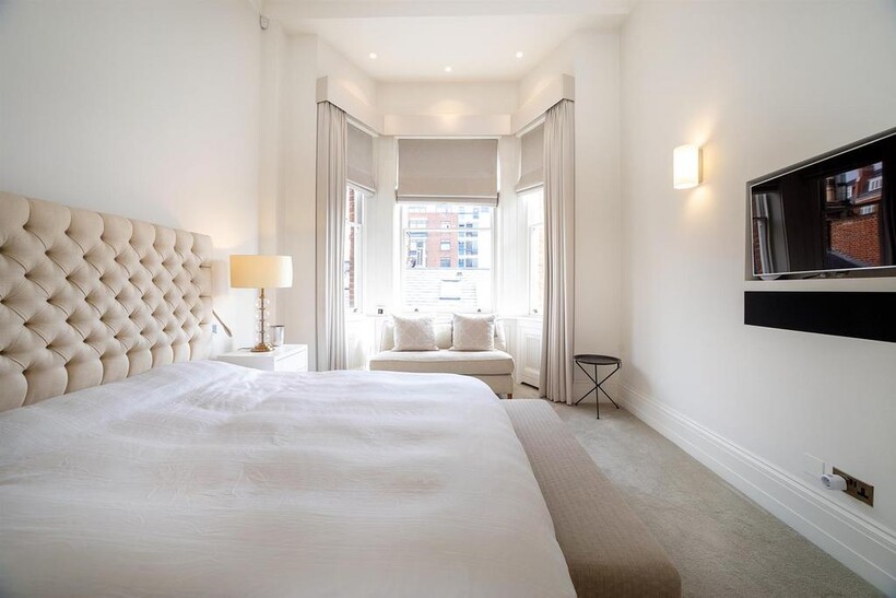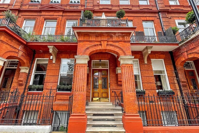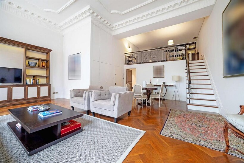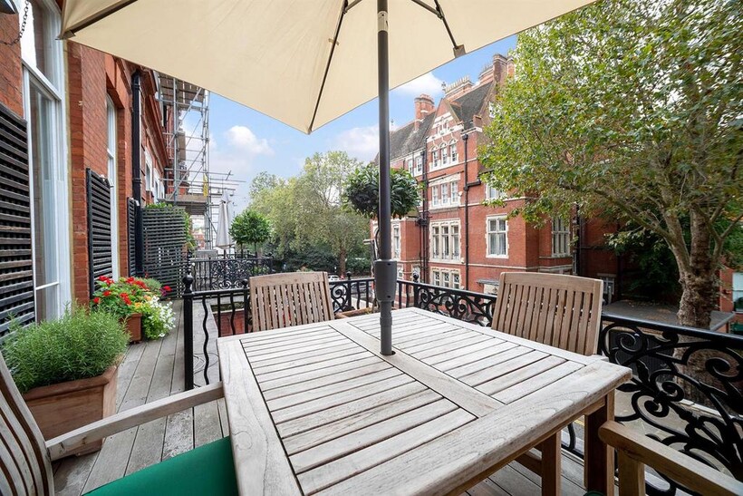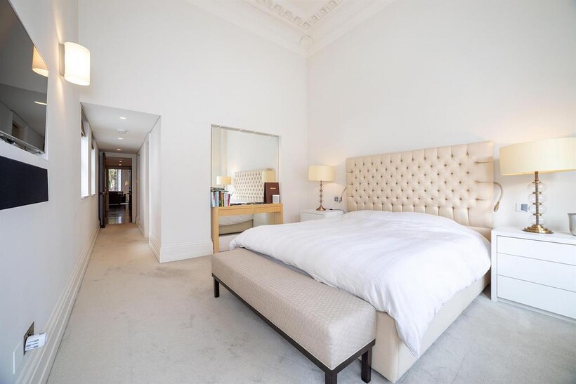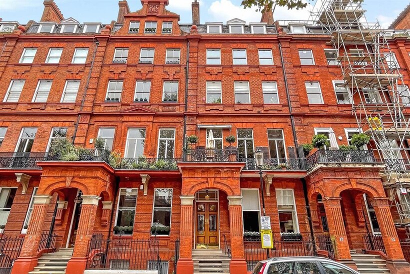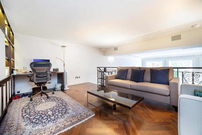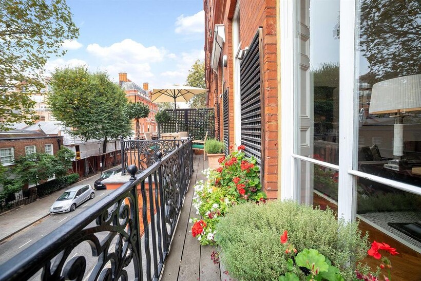 An impressive beautifully presented first floor apartment with 4 metre high ceilings and 3 floor to ceiling windows in the reception room leading to the balcony In a well run red brick Grade II listed building on this sought after garden square in the heart of Knightsbridge, refurbished to the highest standard comprising three bedrooms, 3 bathrooms, mezzanine TV area and fitted kitchen with the benefit of air conditioning throughout, lift, storage room and access to communal gardens (by separate application)