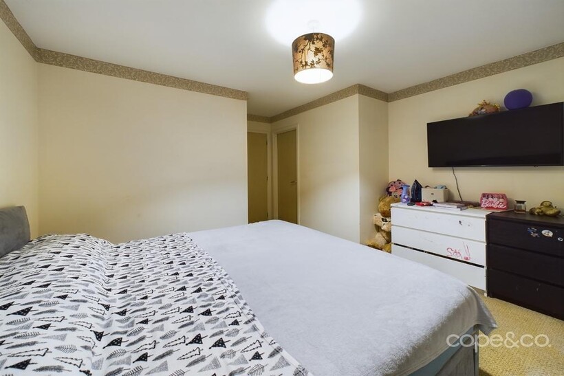 This apartment features two comfortable bedrooms. The master bedroom is a generous double, providing a peaceful sanctuary for rest and offering plenty of space for bedroom furniture. The second bedroom is a single, ideal for use as a guest room, a child's bedroom, or a dedicated home office, catering to a variety of lifestyle needs. Both bedrooms are presented with a clean and inviting aesthetic.