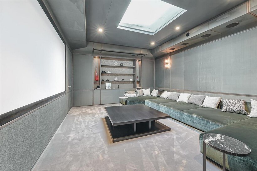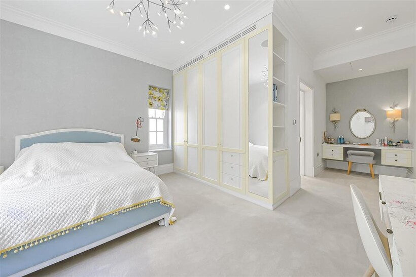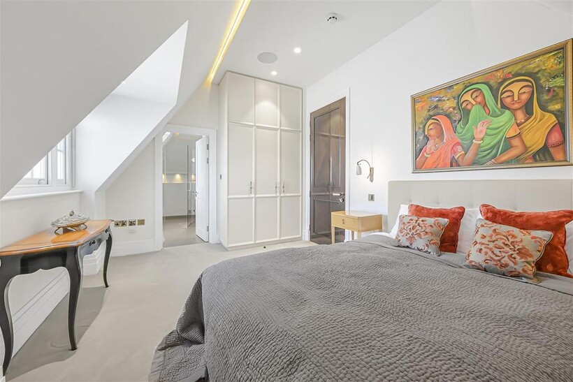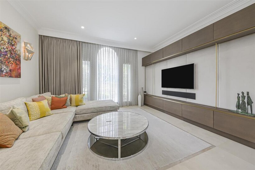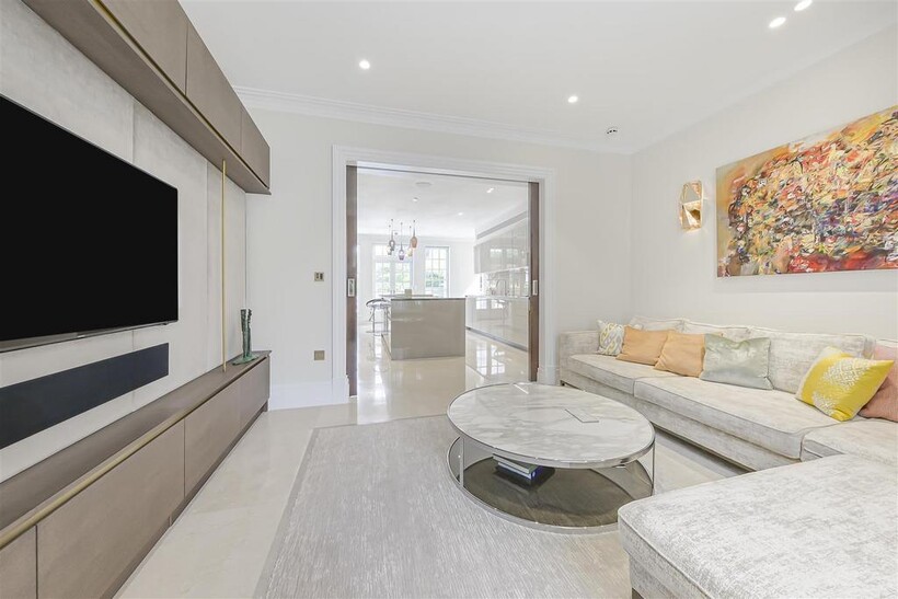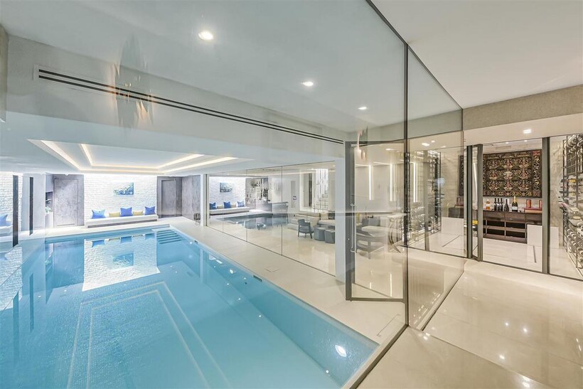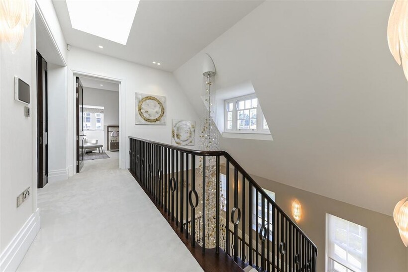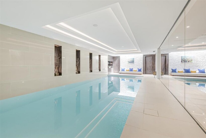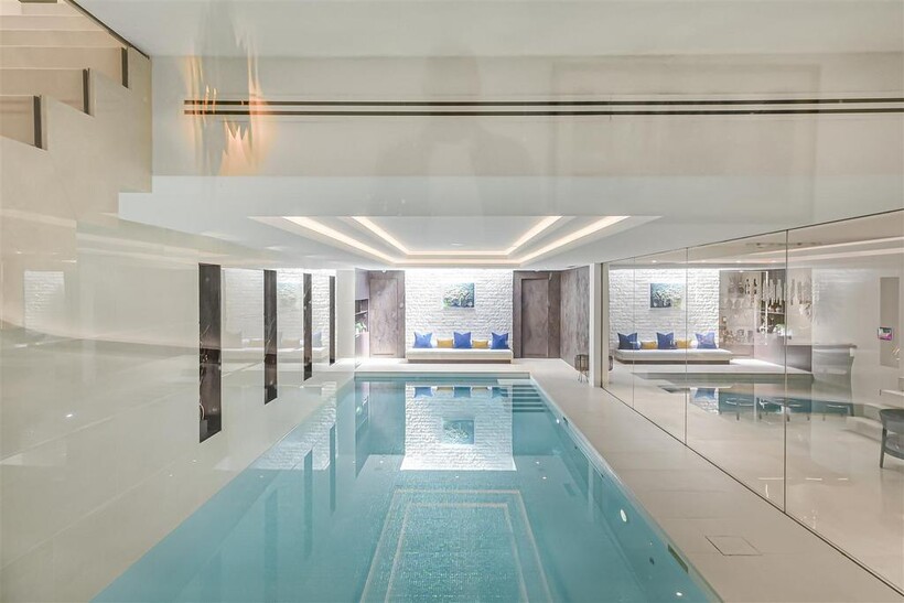 On the ground floor, the house boasts three elegant reception rooms, study, large eat-in kitchen with breakfast area and guest w/c, The second floor comprises of a master suite and 2 ensuite bedrooms. The third floor has a further 2 ensuite bedrooms and a playroom/library. The basement has a large indoor swimming pool, cinema, lounge with bar, wine cellar, staff bedroom with bathroom and utility room. Off street parking for up to three cars and a generously sized garage with a beautiful landscaped garden.