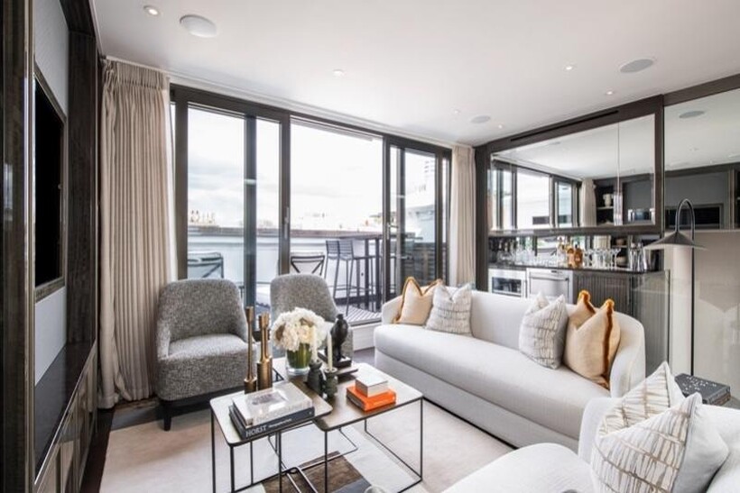 The top floor comprises a sleek fitted kitchen with Carrara quartz kitchen worktops and Cohiba marble surfaces, bespoke high-gloss veneered kitchens with Gaggenau and Miele appliances, luxury bespoke joinery to the living room and bar. The bar has a wine cooler and ice making machine.