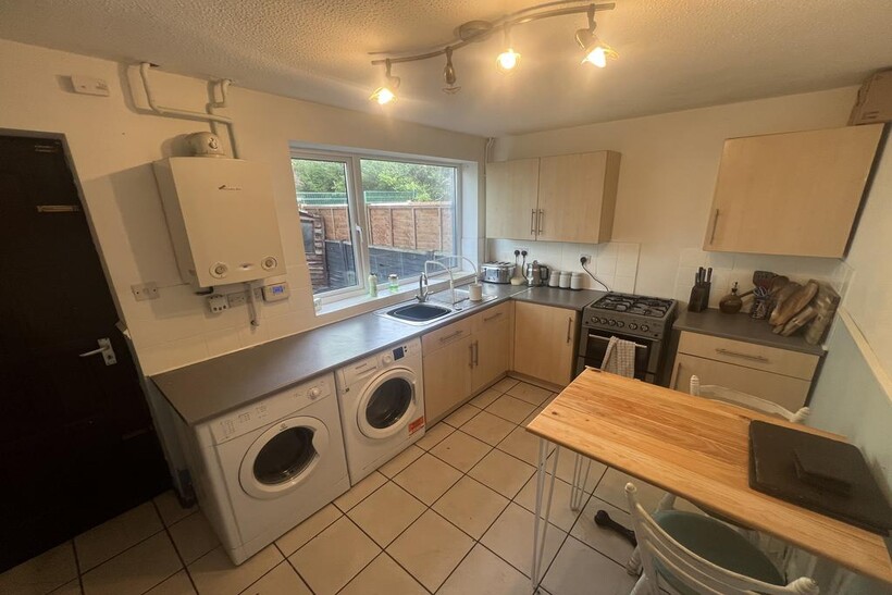 Having wall, base and drawer units, freestanding gas cooker, plumbing for washer/dryer and space for further appliances, tiled flooring, window to rear and door leading out to the garden.