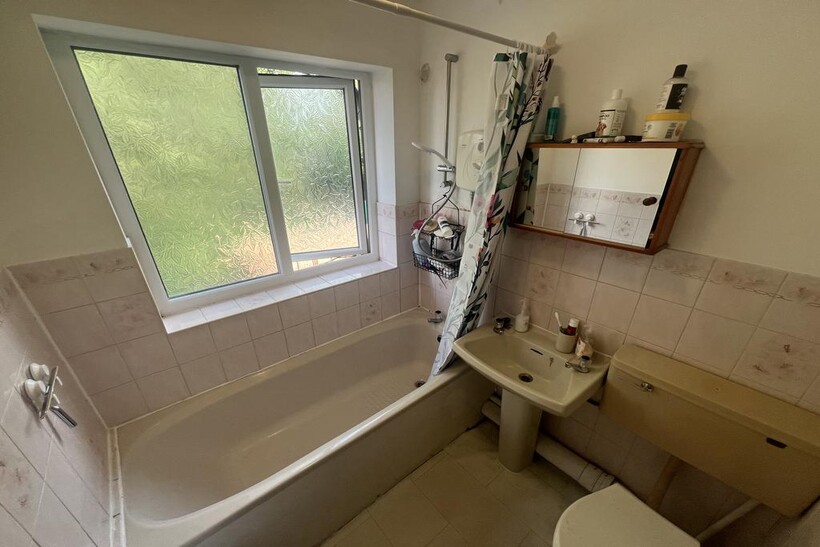 Having 3pc suite with WC, basin and bath with shower over, mirrored wall cabinet, vinyl flooring and window to rear.