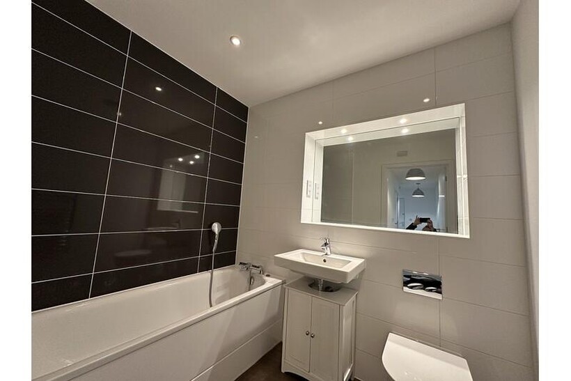 Bathroom - three piece suite comprising low level wc, wall mounted wash basin and bath with shower over, extractor fan, chrome heated towel rail, tiled flooring.