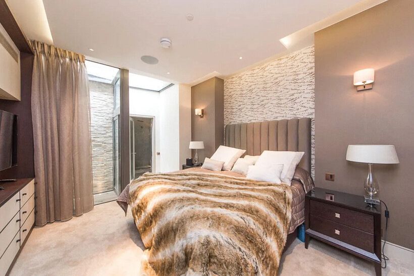 The lower levels comprise three more spacious double bedrooms, two of which have dressing areas and en-suite bathrooms with light wells, a maid's en-suite bathroom and patio area, a family reception area, a large TV room, a further open-plan reception and dining area, a luxury fully integrated kitchen with a central island and serving area, a separate "smelly kitchen" for aromatic dishes, a private cinema, a large bar, and an exceptional private spa with swimming pool, steam room, sauna and massage room.