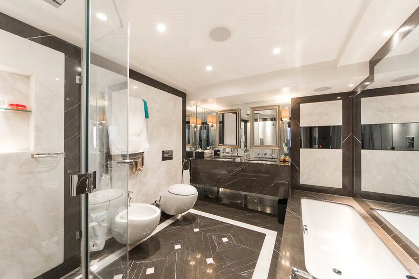 The apartment further benefits underfloor heating, air-conditioning throughout, as well as an inter-room entertainment system, a private parking space and porterage.