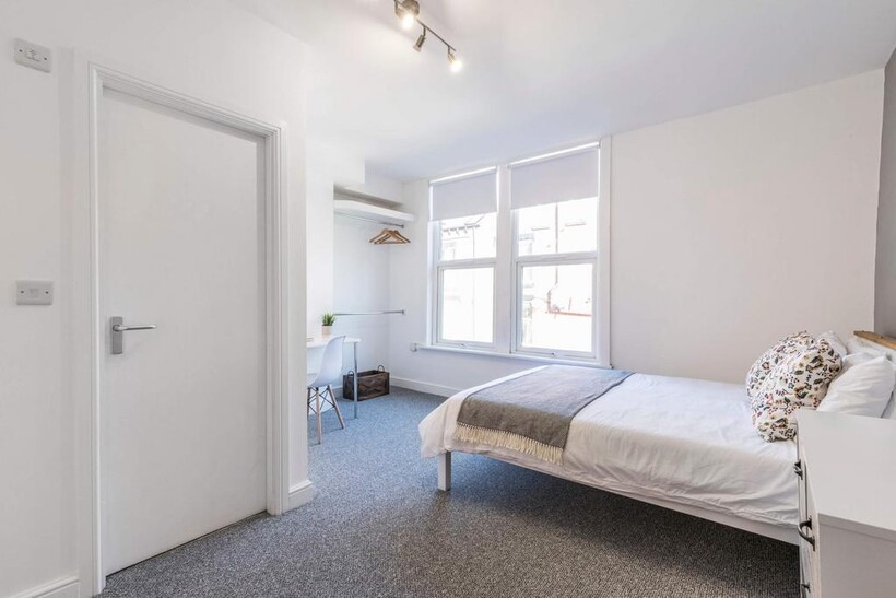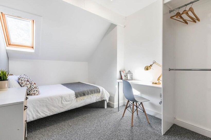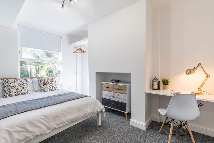 • 6 large double bedrooms, fully furnished with everything you need: double bed, wardrobe, chest of drawers, bedside table, full-length mirror, desk, and chair - ideal for both study and relaxation.