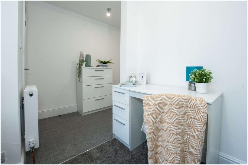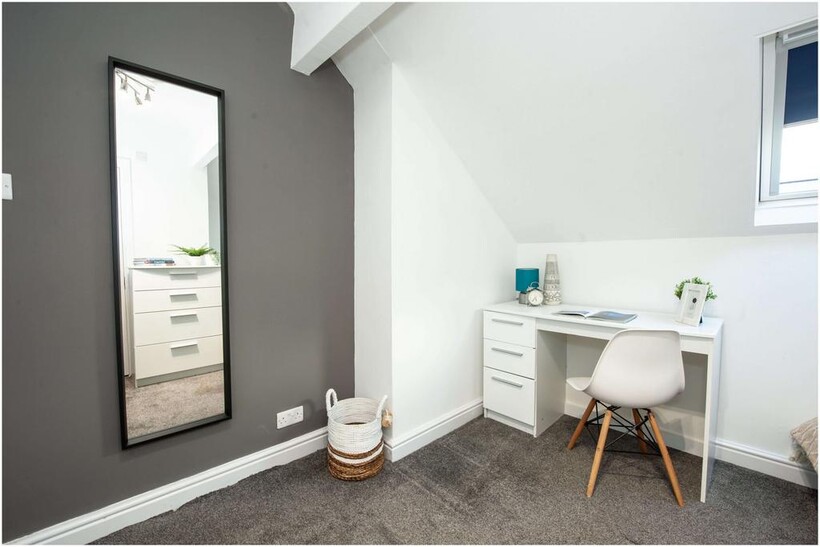 • 6 large double bedrooms, fully furnished with everything you need: double bed, wardrobe, chest of drawers, bedside table, full-length mirror, desk, and chair - ideal for both study and relaxation.