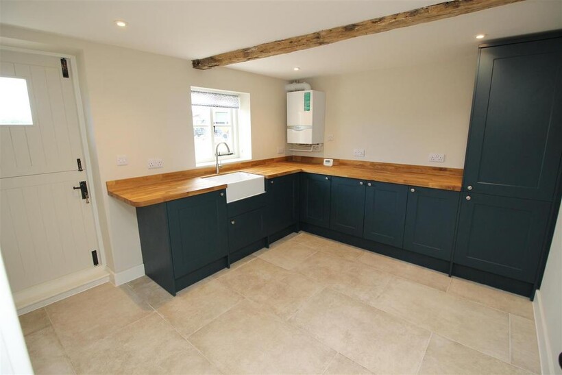 Utility Room - 3.53m x 3.35m (11'7" x 11'0") - The tiled floor continues into the utility room. A stable door opens into the rear garden area and window overlooking the garden. With a range of dark blue base units, inset wooden worksurface with inset butler sink and mixer tap over. Integrated Lamona fridge and Washer/dryer. Inset spotlights and a valiant LPG gas boiler.