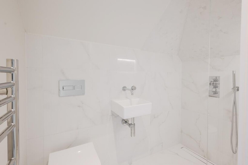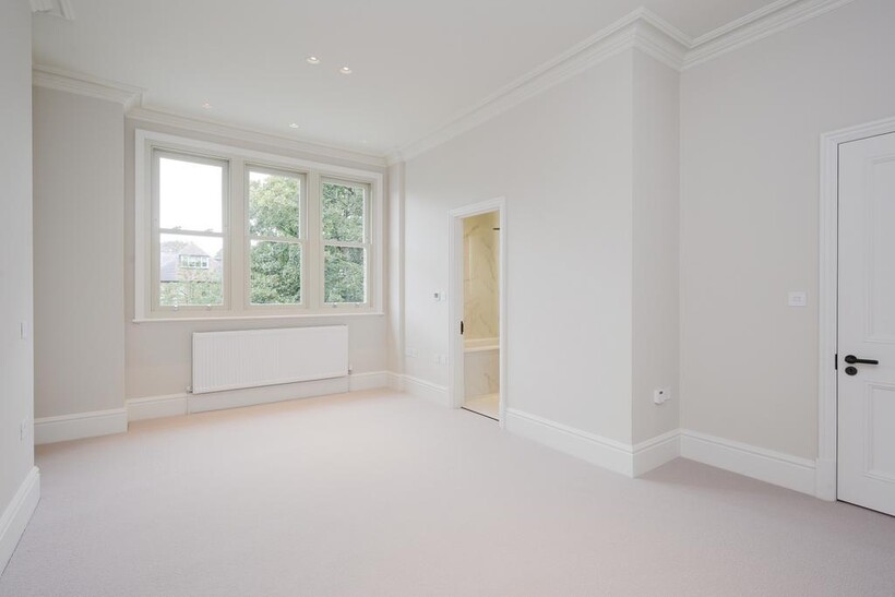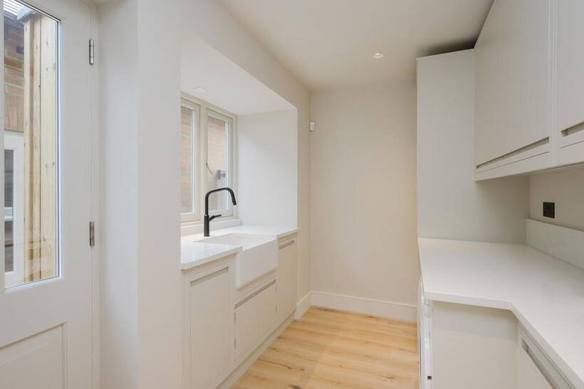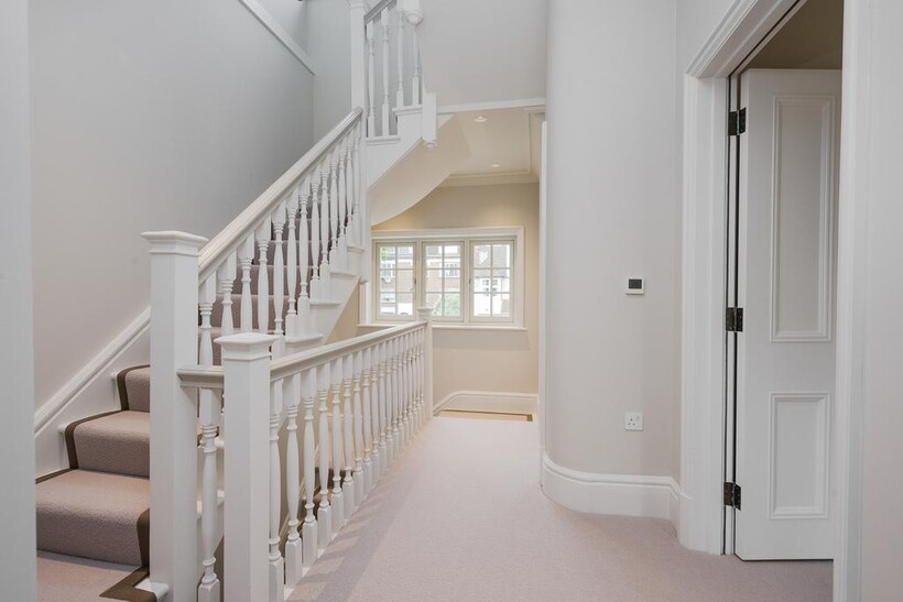 The house comprises: - Entrance hall, formal living room, with rounded bay-window, and at the rear a large open-plan kitchen/family/dining space with glazed doors out to the rear garden. Additionally there is a guest WC and utility room with side access and door to cellar. On the first floor there are three generous bedrooms, including the main principal suite with ensuite bathroom, and a family bathroom. On the second floor there are two further bedrooms, both with ensuite bathrooms.