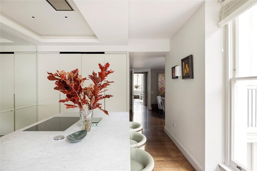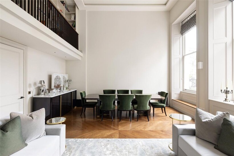Overlooking South Kensington’s St Jude’s Church to the front and a verdant garden square to the rear, this three-bedroom triplex apartment is enveloped in a sense of peaceful seclusion. Thanks to an extensive renovation, the home now stands as a showpiece of refined interior design; expect custom finishes and sleek technology that make a feature of its smart period framework. Outside, a soaring heritage façade features decorative mouldings, cast-iron railings and a grand portico entrance. Beyond its handsome exterior, take the lift to the first floor where an expansive double-height reception room makes a bold first impression. Solid oak flooring and pale walls offer a neutral framework for the space, which is bathed in light through two large sash windows. The eye is cast upwards across the 5.13 metre-high ceilings and mezzanine library level, while the floor is subtly zoned between lounging and dining. Technology is discreetly integrated here, from comfort cooling to overhead audio systems.