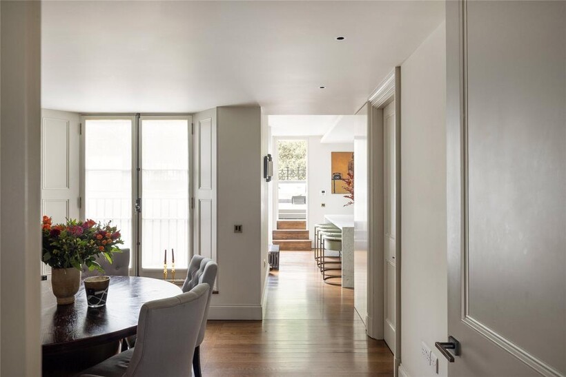 The open-plan kitchen and dining room has a quietly sophisticated feel. A stone island centres the culinary space, which is surrounded by handmade soft-close joinery and hi-tech appliances. Natural light beams through a series of windows, while a set of oak steps leads out to the private roof terrace.
