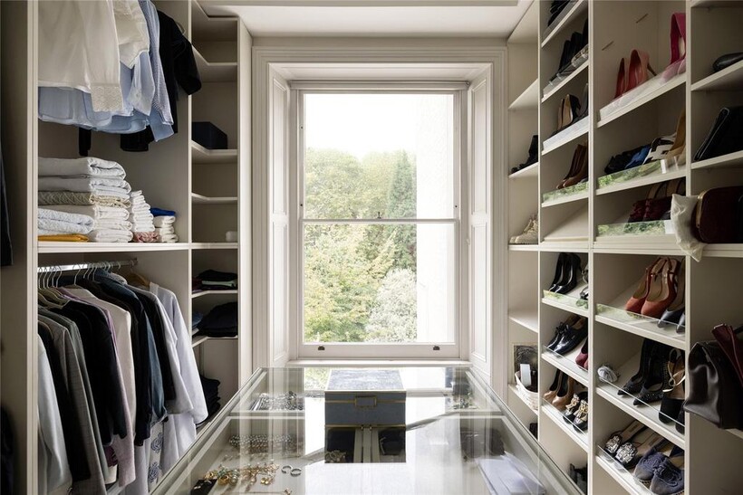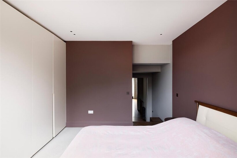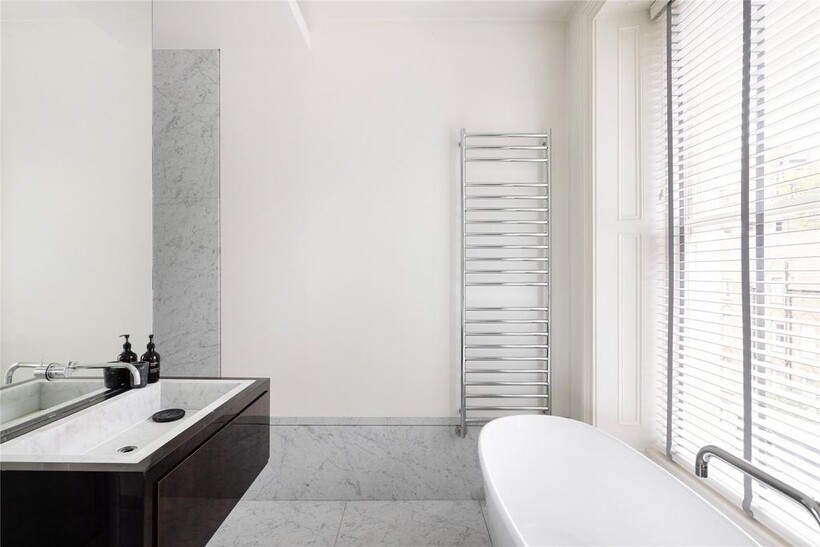 The bedrooms are accessed by the lift or a fair faced concrete spiral staircase, ascending upstairs with architectural prowess. On the third floor, the principal bedroom suite is crafted with greyscale walls and upholstery, gently lit through a pair of sash windows. Its en suite bathroom is a stylish affair with Carrara marble floors, a bespoke walnut vanity, freestanding bathtub and underfloor heating. Next door, there’s a walk-in wardrobe complete with custom-fitted wardrobes – and an additional bathroom suite attached.