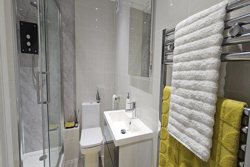 Fully tiled shower room has large walk in shower, vanity unit under basin.