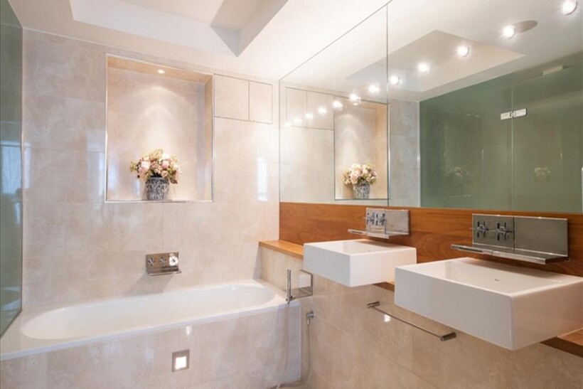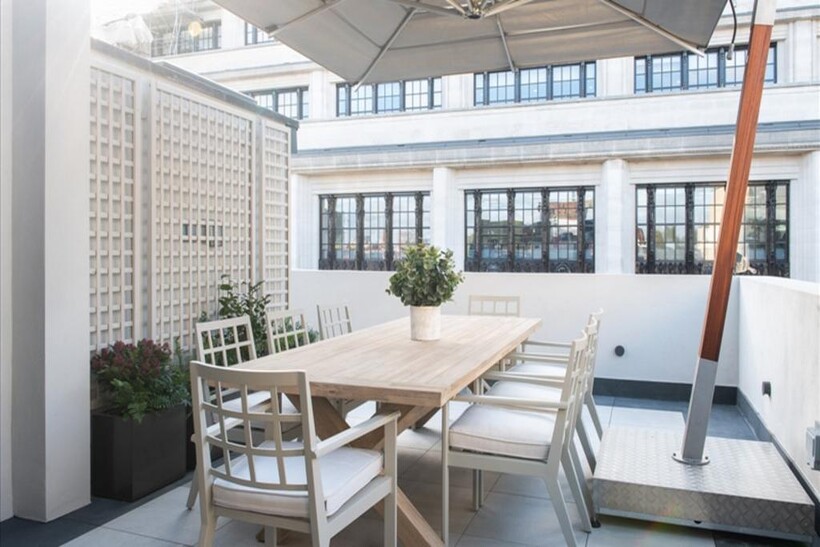 These sun-drenched terraces provide distinct lounging and dining zones, ideal for alfresco living, private entertaining, or simply enjoying panoramic London views.