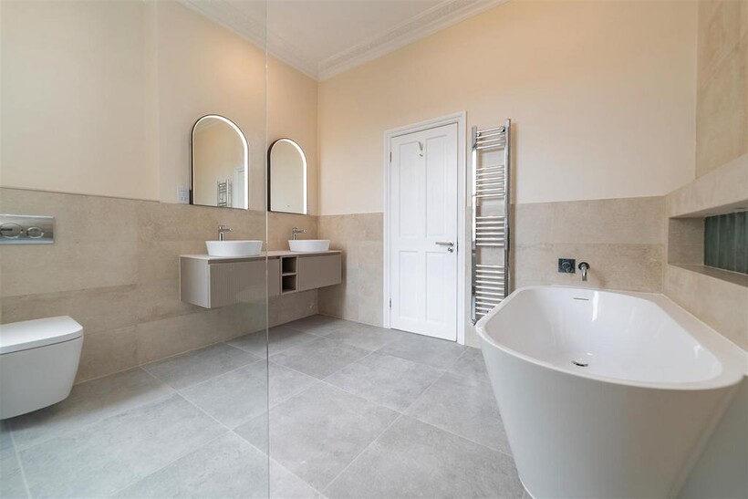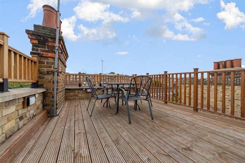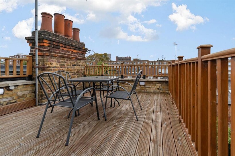 The first floor provides a principal bedroom suite with a large en-suite bathroom, plus a further double bedroom and shower room. On the second floor are three well-proportioned doubles, one with en-suite, and a family bathroom, while the top floor offers a further double bedroom with en-suite and access to the roof terrace.
