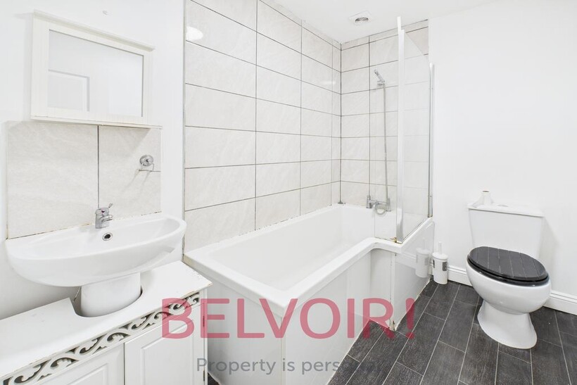 Fitted with a white 3 piece suite comprising of a push button w/c, pedestal wash hand basin and an L shaped bath. The wash hand basin has a vanity unit fitted below and a mirror above. The bath is fitted with a shower attachment from the taps and has a glass shower screen.