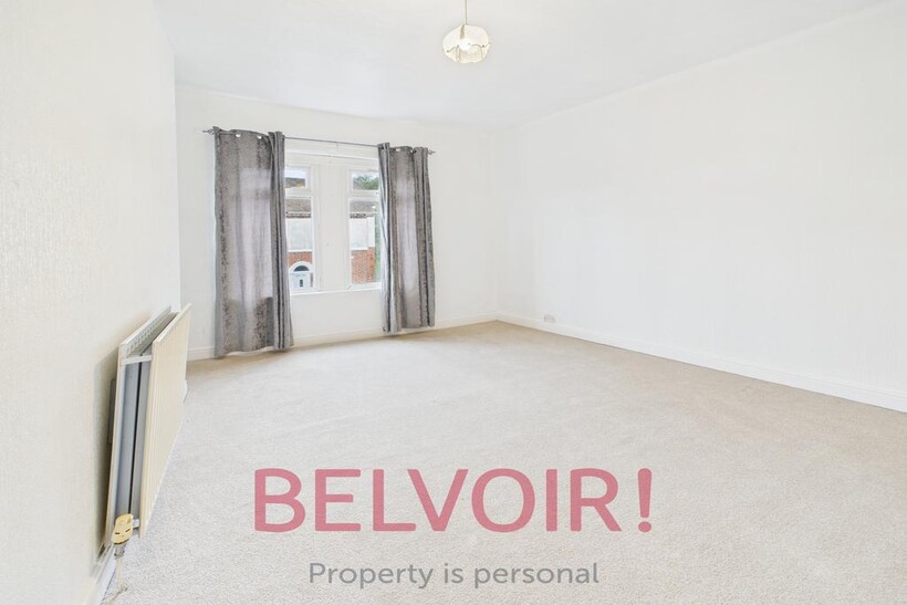 A spacious double bedroom located to the front of the property. Featuring a large window fitted with curtains.