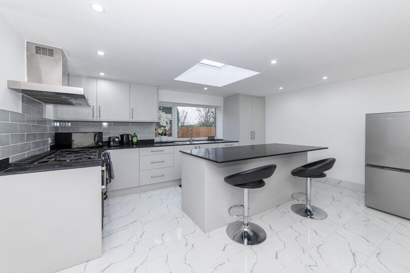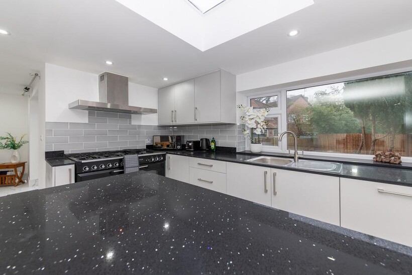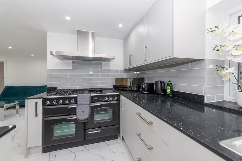The modern kitchen is fully equipped for all your cooking needs, and the home offers ample space for your needs.