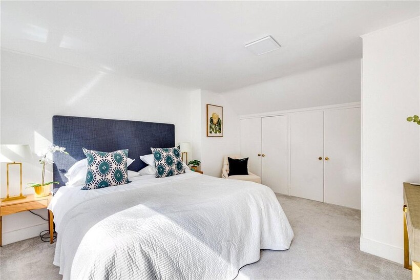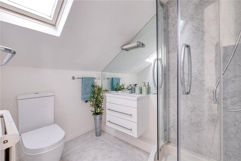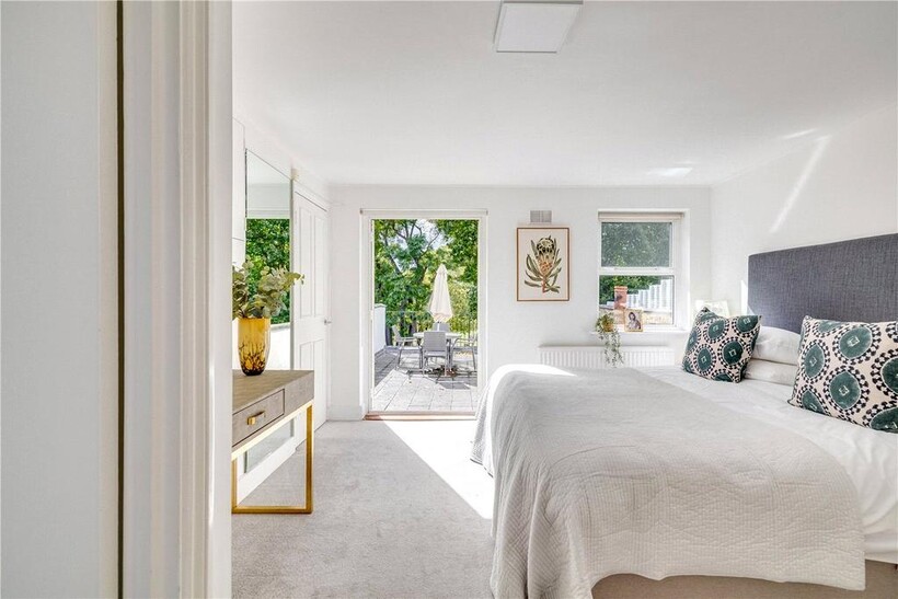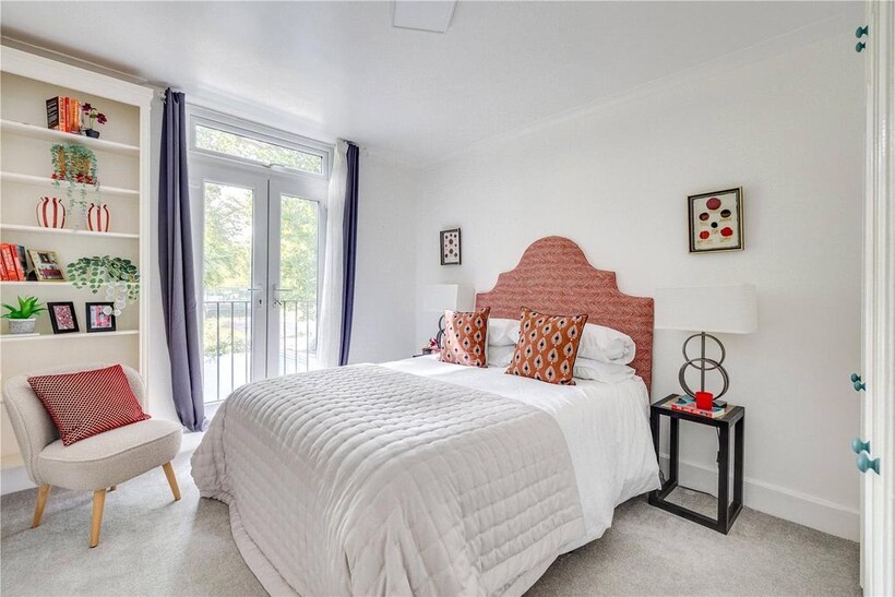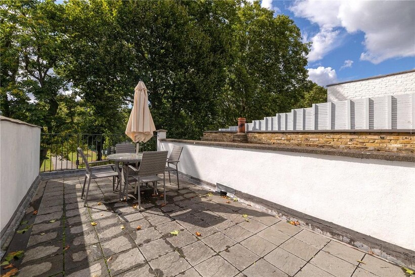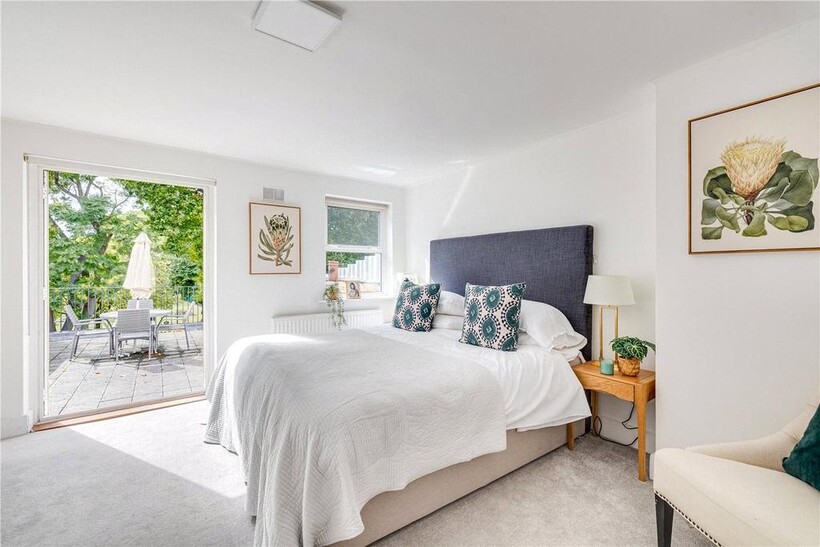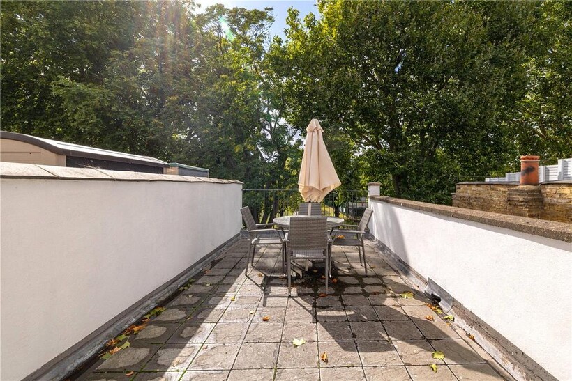 The top floor is home to the master bedroom with built-in storage and its own modern shower room. From here, French doors open onto a large private roof terrace with leafy views across South Park.