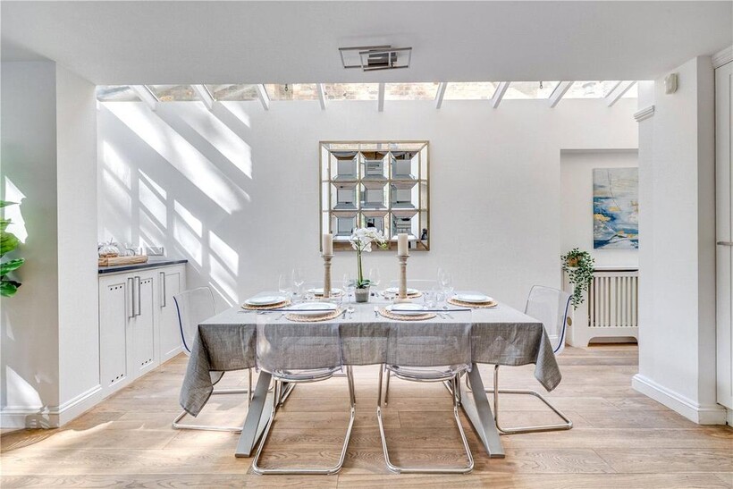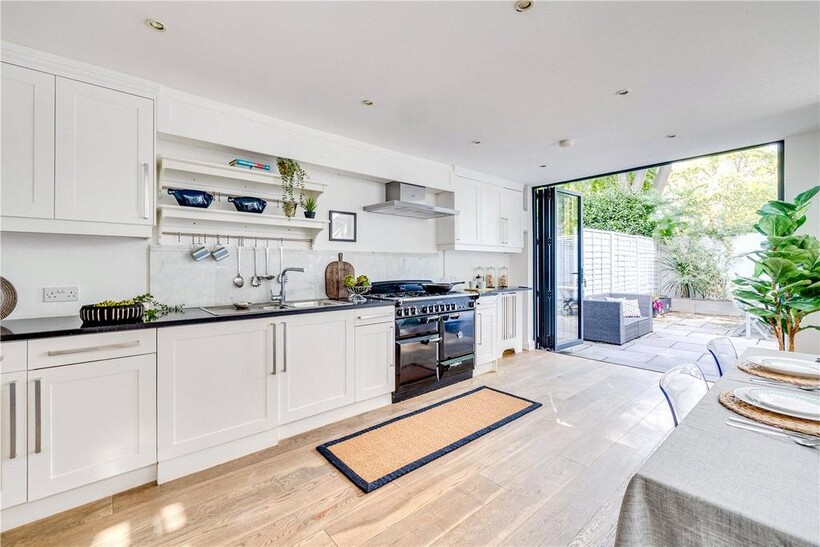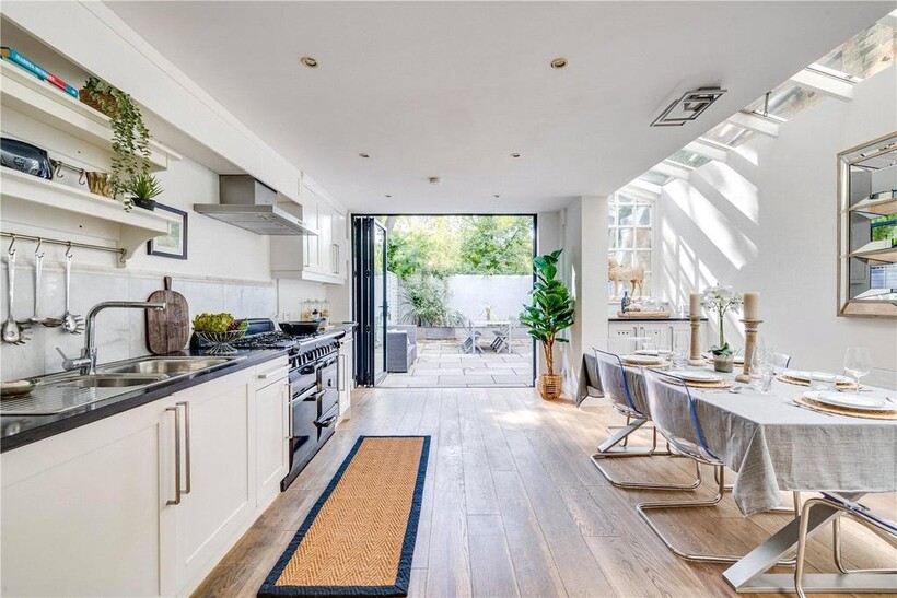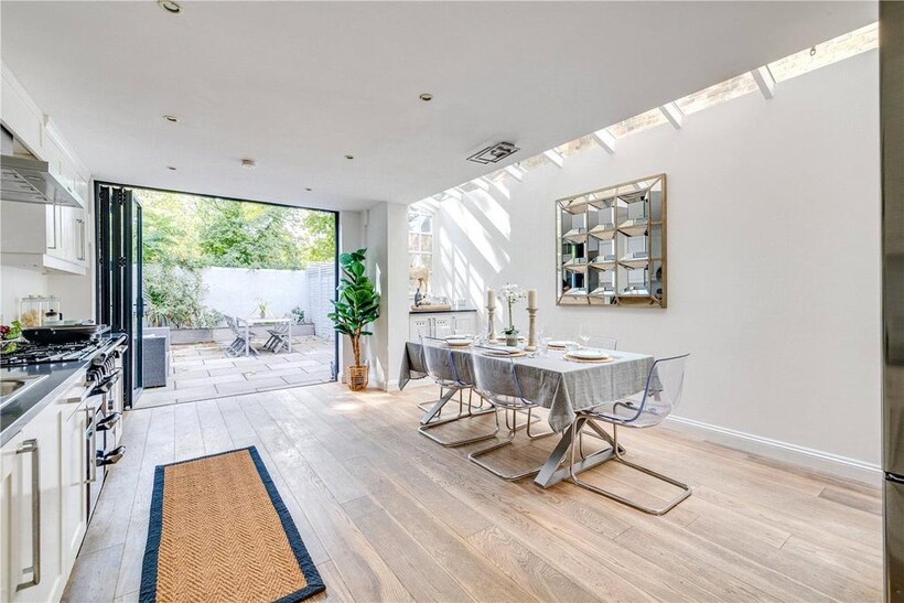 Contemporary cabinetry, a large range cooker, and polished finishes create a sleek, practical environment for family living. Bi-folding doors open directly onto a smartly landscaped south-facing garden, seamlessly blending indoor and outdoor living.