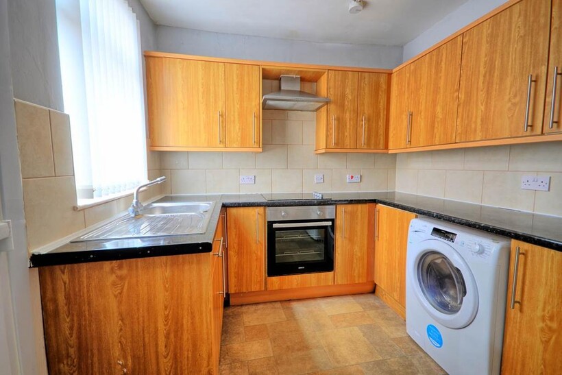 The house has an excellent kitchen with wooden effect doors, black high quality worktops and black splashback tiles, a free standing fridge/freezer and integrated oven and hob.