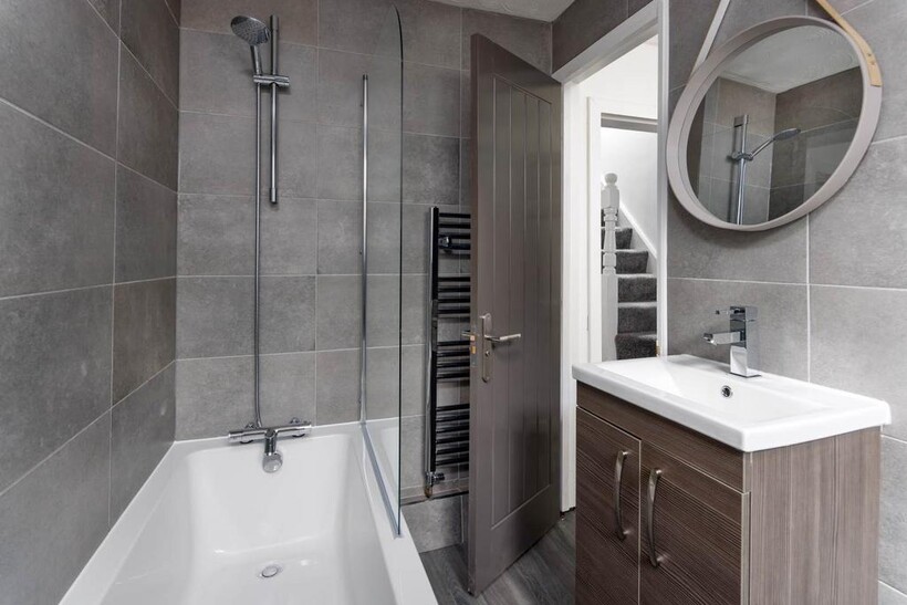 The bathroom is fully refurbished - modern and well appointed, with a bath and shower, WC and vanity unit sink.