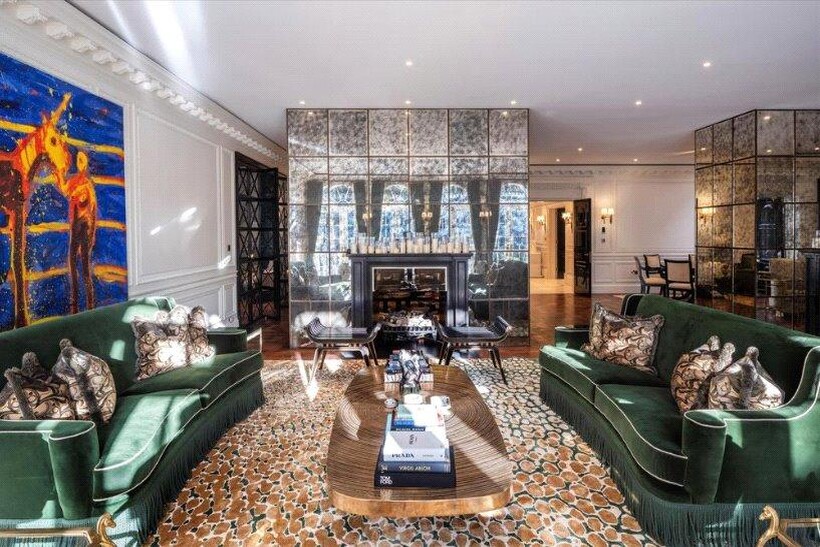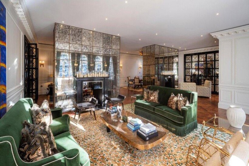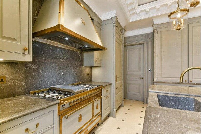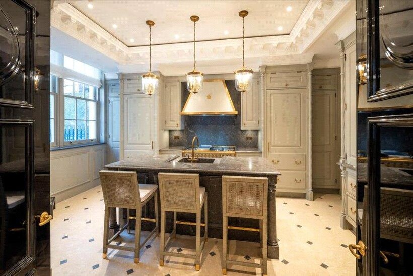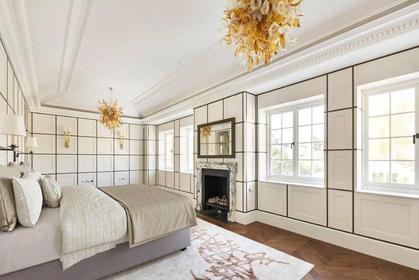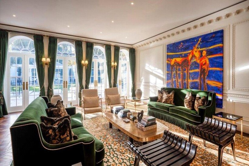 wooden floors, intricate cornicing & large windows all add to a sense of grandeur in this impeccably finished home. The impressive nature of the property is apparent upon entry as you enter into a grand entrance hall which has impressive views of the verdant garden and is cladded in Crema Luna stone & features a sweeping staircase. The kitchen, which has top of the range appliances & a discreet dumb waiter which leads to the additional chef's kitchen. Both the formal & professional kitchens were fully fitted by Mark Wilkinson Furniture, with Wolf & Miele appliances & a beautiful Officine Gullo range in the family kitchen. Located on the ground floor there is also a formal dining room for twelve set in a conservatory with a fireplace overlooking the garden, a reception room which contains five large double French arched doors onto the garden, a formal reception room with four double fireplaces, family room & cigar and drinks room. Two principal suite bedrooms, each with dressing rooms & en suite bathrooms & a tented study are situated on the first floor