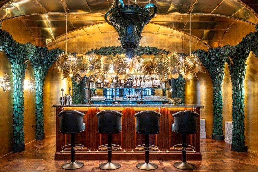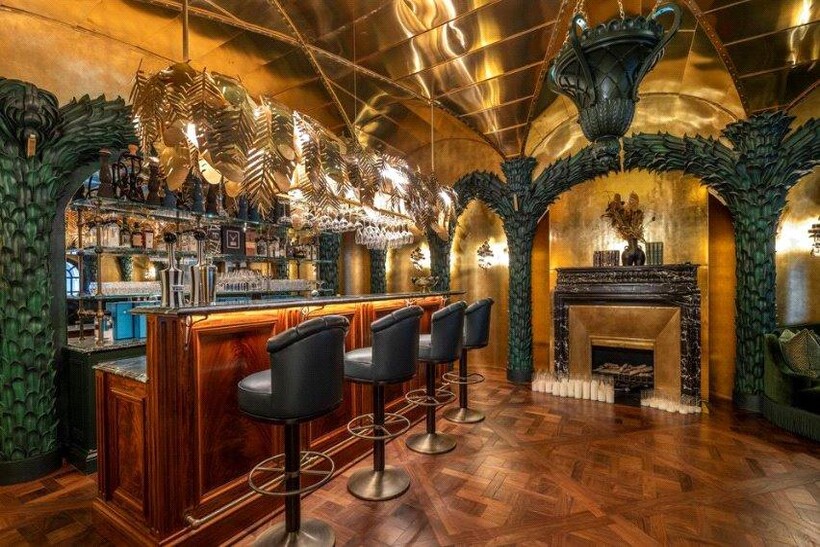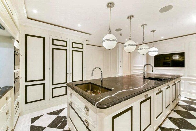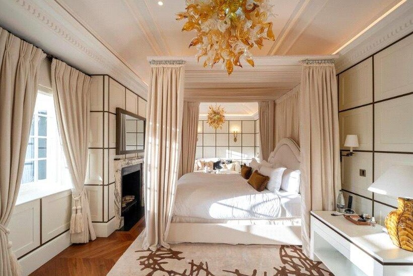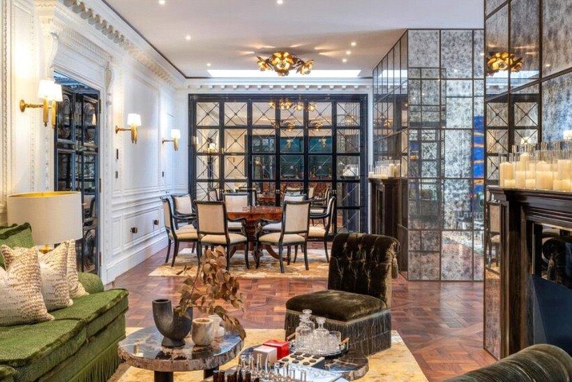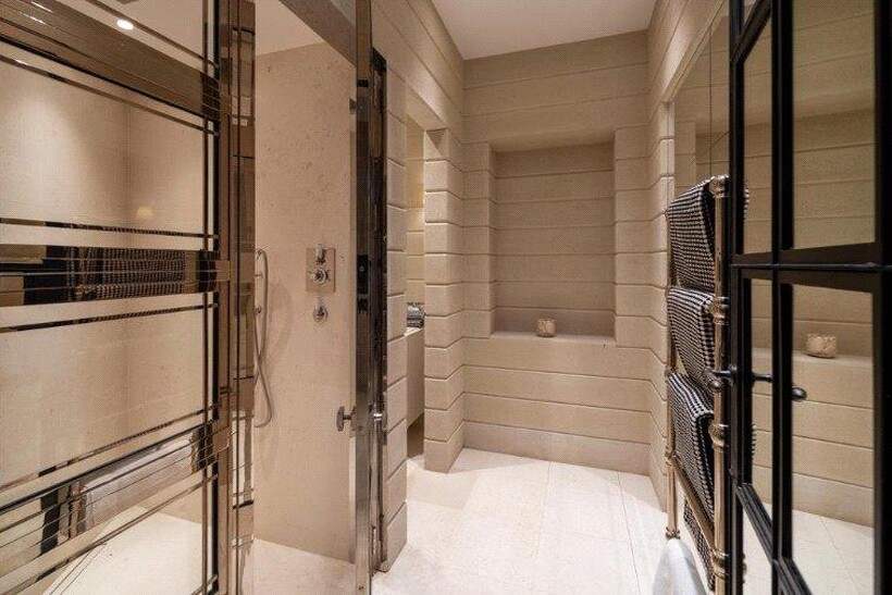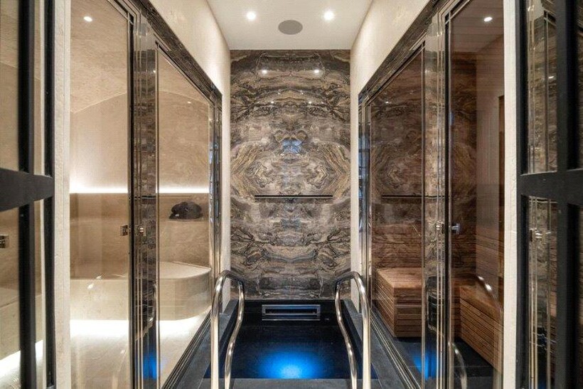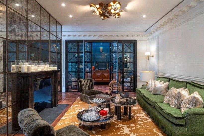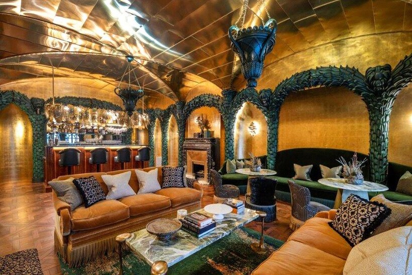 & all overlook the garden. Soaring ceiling heights of four metres are found across the lower ground floor which has three large en suite guest suites, each of which have dressing rooms & their own dedicated courtyard. An impressive club room with vaulted brass ceilings, a fully equipped