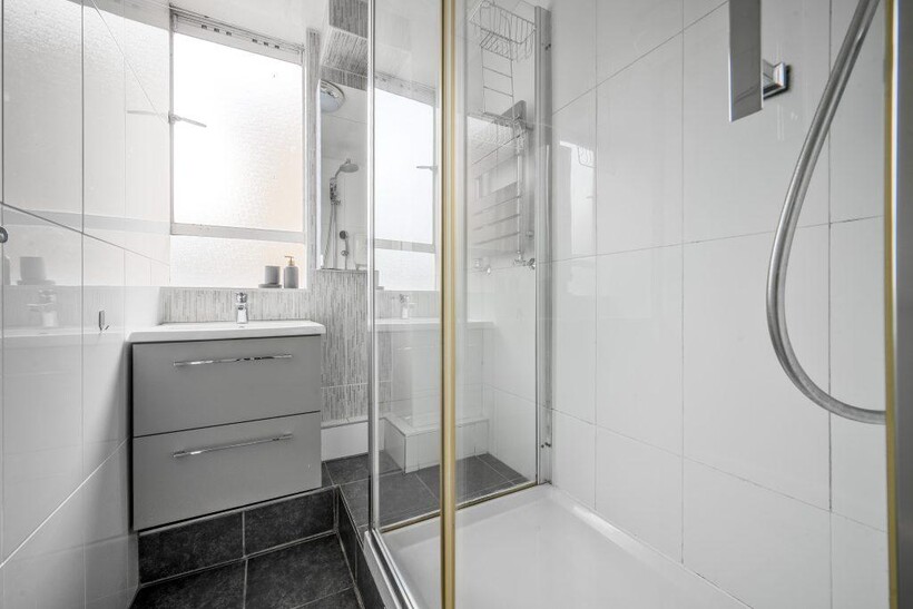 The bathroom has been tastefully modernised with a large walk-in shower, vanity unit and stylish tiling. A frosted window provides natural light while maintaining privacy. Fixtures are contemporary and finished in chrome for a polished look.