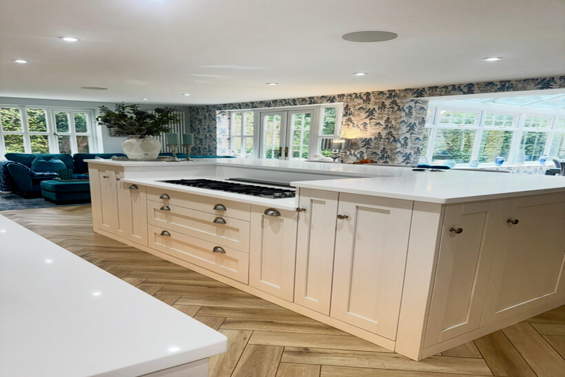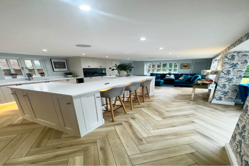 Modern open plan kitchen & living area with French doors