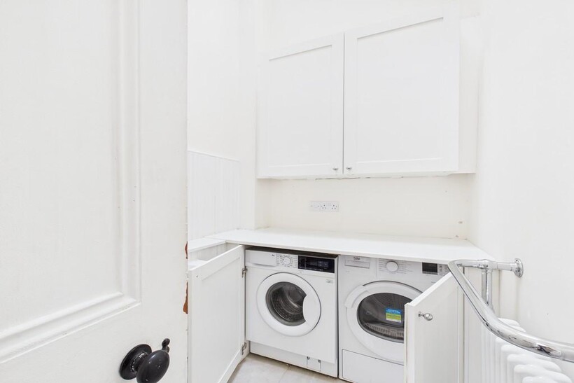 The kitchen has been professionally designed and installed by artisan craftsmen to curate a bespoke range of wall and floor mounted cabinetry finished in solid white slab and topped with complementing granite work surfaces. Glazed storm doors open directly to the rear with an iron staircase to provide access to the rear gate. The kitchen is a wonderful space for the aspirant cook of the house to utilise with the dining room adjacent. The kitchen is fully equipped with electric oven, gas hob, dishwasher and freestanding larder style fridge freezer.