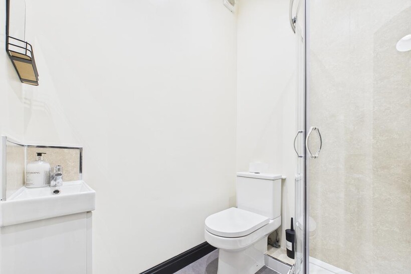 The bathroom features a sleek, contemporary design, complete with a shower, sink, toilet, and a heated towel rail, ideal for keeping towels warm during the colder months.
