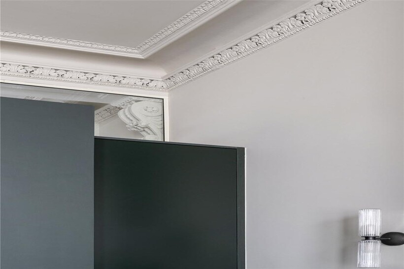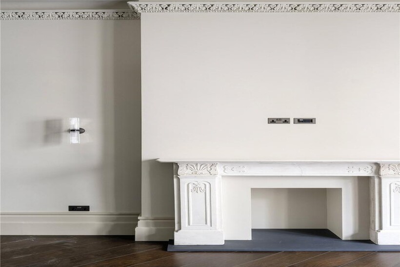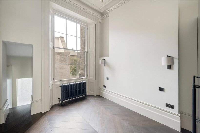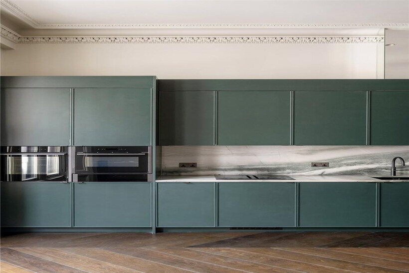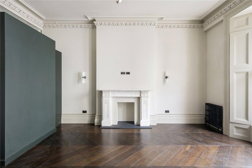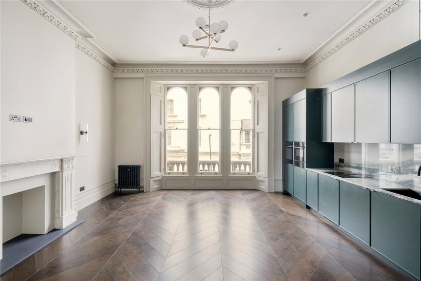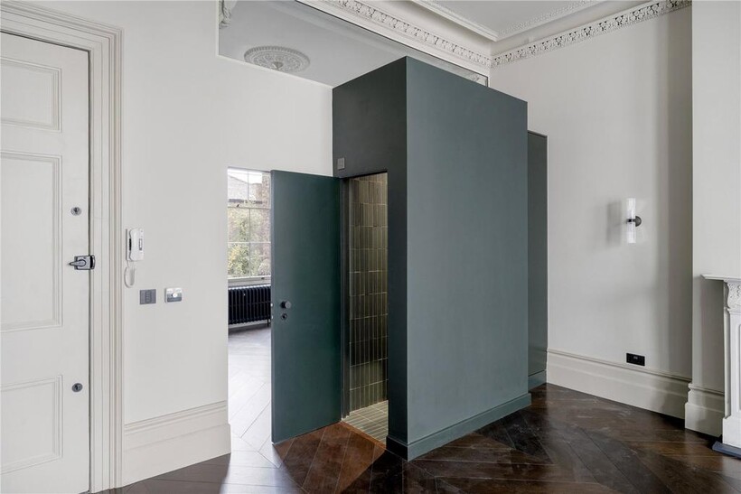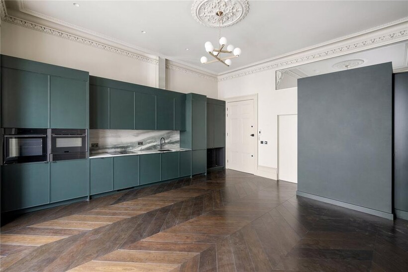 A masterclass in Victorian restoration meets contemporary design. This exceptional one-bedroom apartment unfolds behind a commanding 9ft entry door, revealing a dramatic open-plan reception and kitchen flooded with light from floor-to-ceiling arched windows, their original shutter systems meticulously restored.Four-metre ceilings soar above herringbone floors, while period cornicing, ceiling medallions and a marble fireplace hearth anchor the space with elegant grandeur. The bespoke kitchen spans the entire east wall: obsidian green cabinetry, Brazilian quartzite worktops with a subtle green gradient, and Neff appliances beside an Elica hob with integrated extraction ravines. An inspired window look-through set high between reception and bedroom amplifies the sense of light and volume.