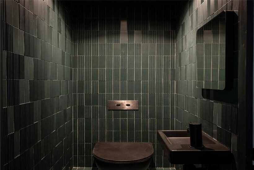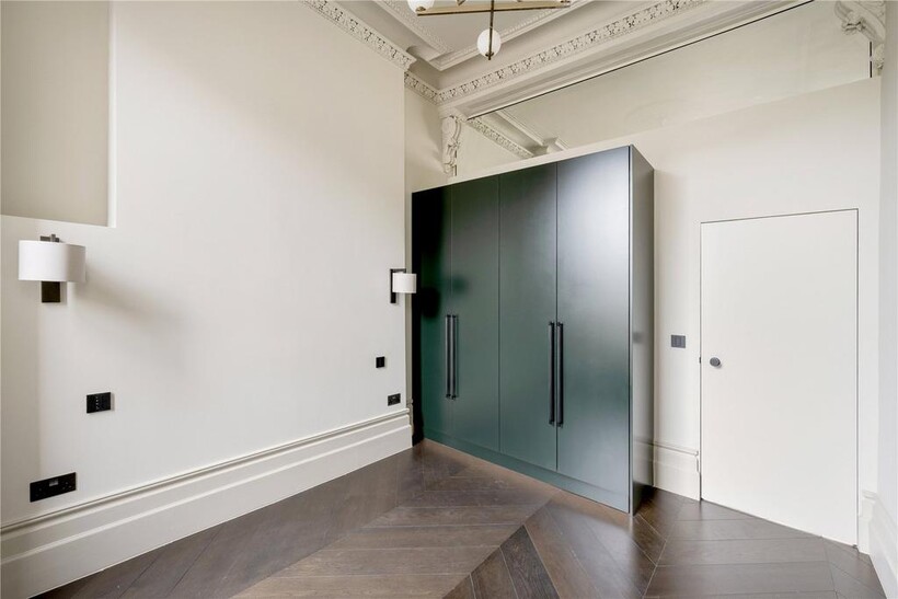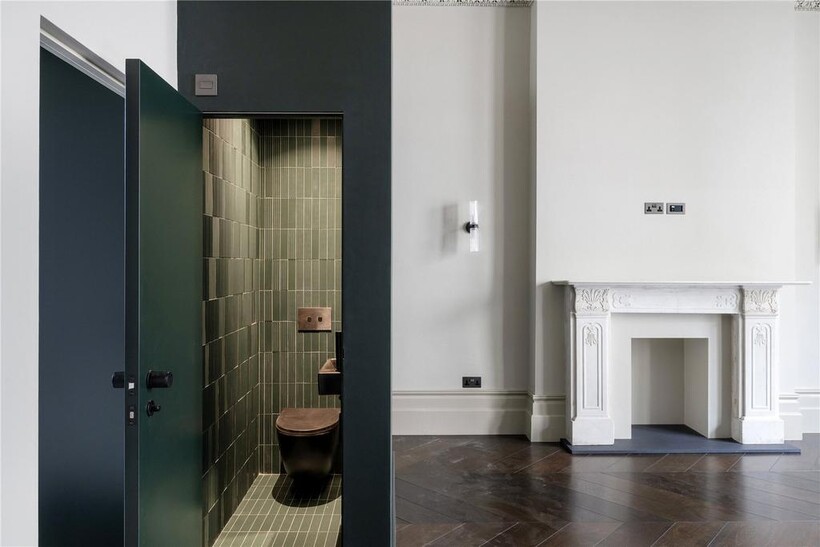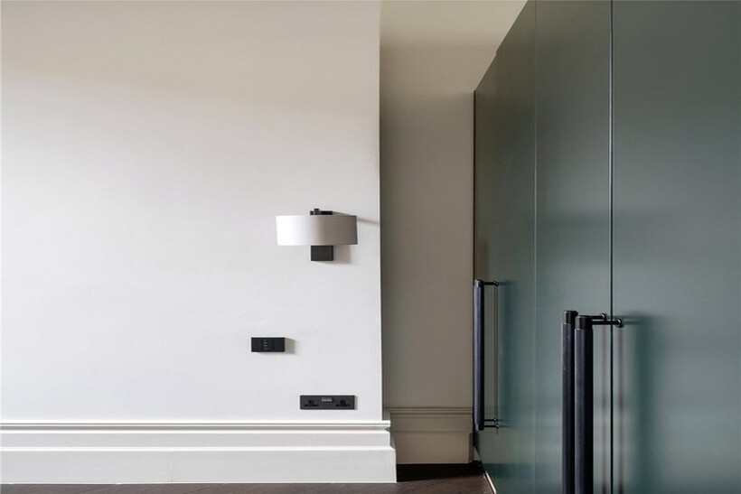 The generous double bedroom continues the property's sophisticated palette with deep fitted wardrobes in that signature obsidian green, illuminated by an imposing Victorian sash overlooking a tranquil internal courtyard. Lutron intelligent lighting throughout adds seamless modern convenience.