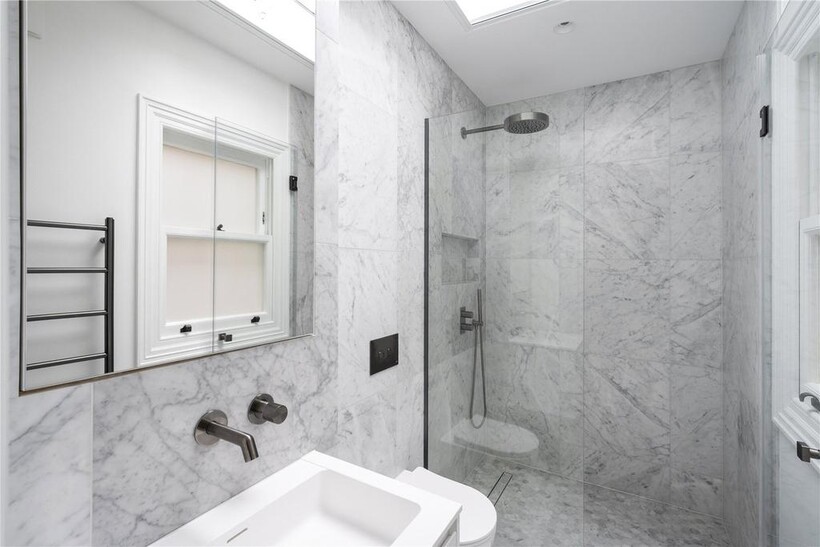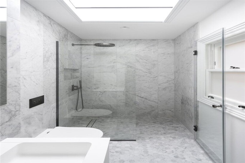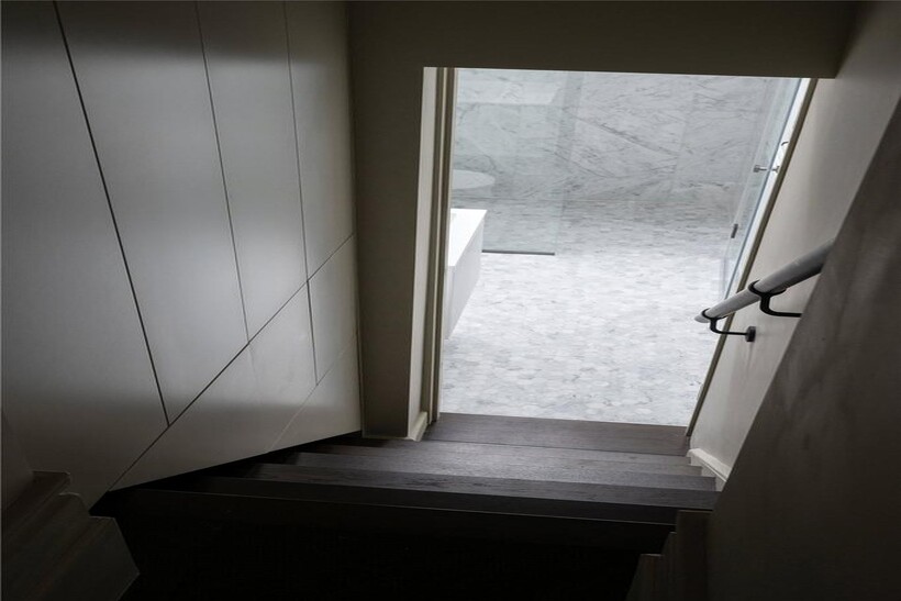 Descend the staircase, complete with integrated storage and ambient, floor-integrated lighting, to discover a sumptuous marble-wrapped en suite that feels wonderfully secluded below.