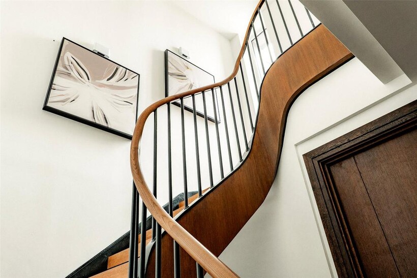 The apartment is presented in superb condition throughout, decorated in a sophisticated contemporary style with wooden floors and refined finishes. Notable features include the elegant curved staircase and abundant natural light from multiple aspects.
