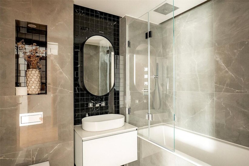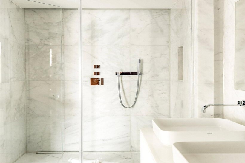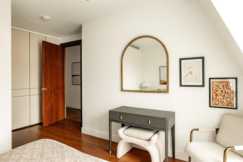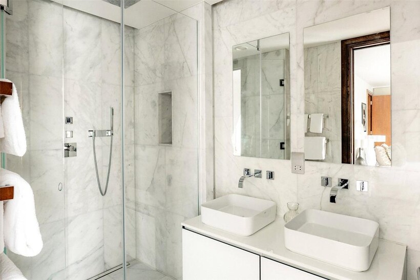 The exceptional private terrace measures nearly 40 feet in length, offering panoramic views across London and substantial space for outdoor dining and entertaining. Three additional balconies provide further outdoor access from the reception room.