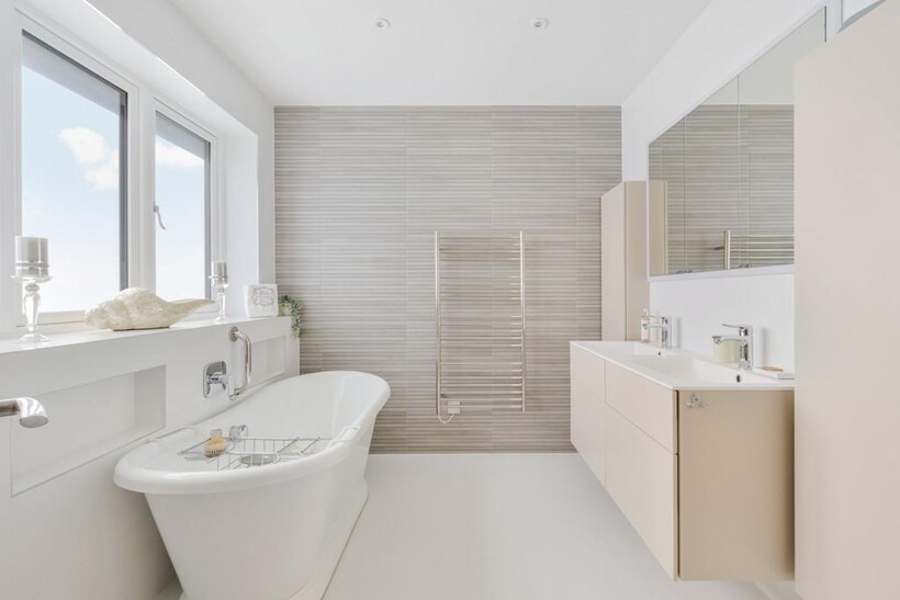 Contemporary bathrooms with sleek chrome fittings, full tiling, and heated towel rails.