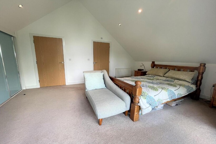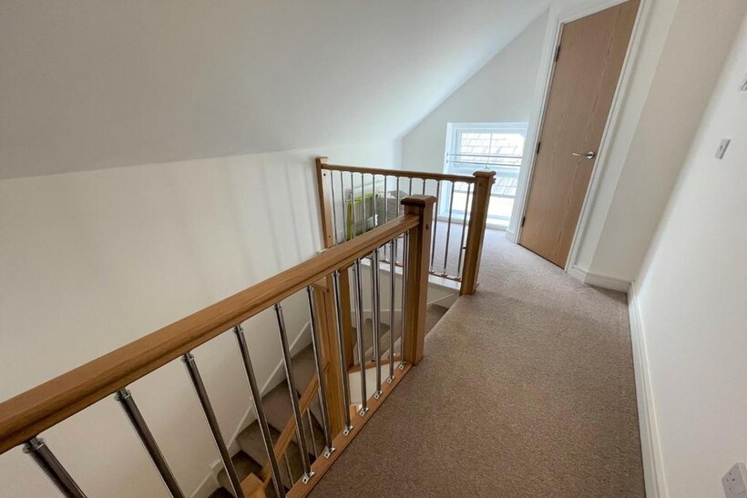 Second Floor: Landing leading to the Master bedroom, with a vaulted ceiling, beautiful picture window leading out to a private sun terrace, ample fitted wardrobes, vast en-suite with separate shower and bath, with Juliette balcony and porthole window.