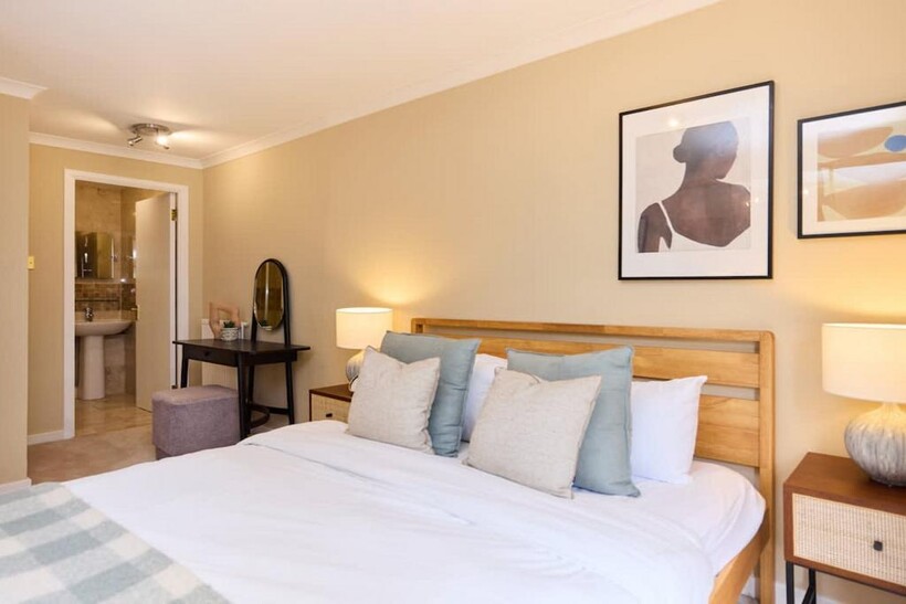 A spacious main bedroom with a king-size bed, bedside tables, chest of drawers, and wardrobe. This room includes an en-suite with shower, toilet, and basin.