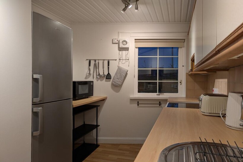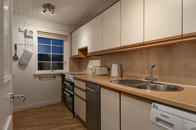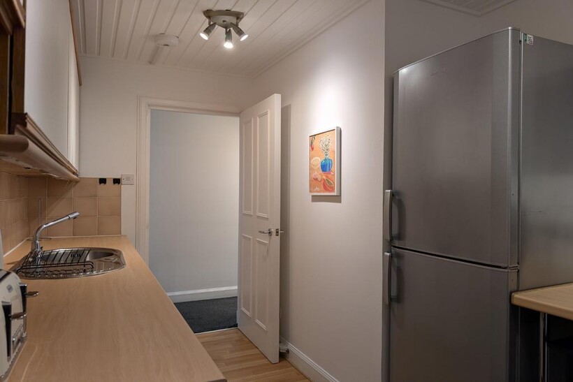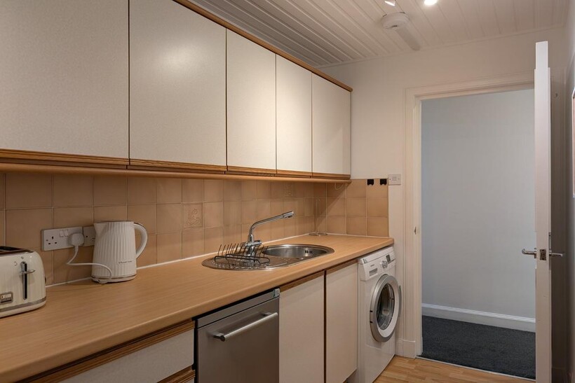The accommodation comprises a welcoming entrance hallway with a generous walk-in storage cupboard, a bright and spacious open-plan living and dining room, and a modern, fully fitted kitchen featuring quality appliances including a tall fridge freezer, washing machine, and dishwasher.