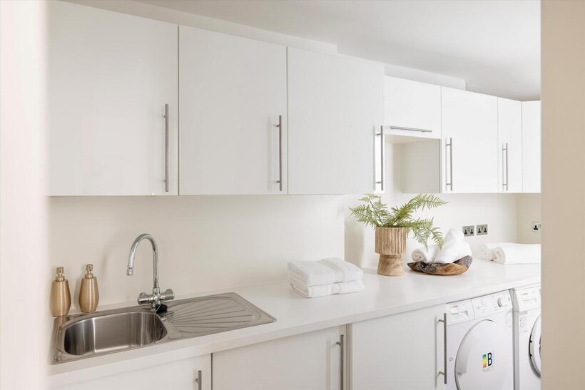 On the lower ground floor are three spacious bedroom suites, each benefiting from its own en suite bathroom. The principal bedroom opens onto a private paved terrace, offering a peaceful retreat, while an additional utility area and second terrace enhance the home’s practicality and flexibility.