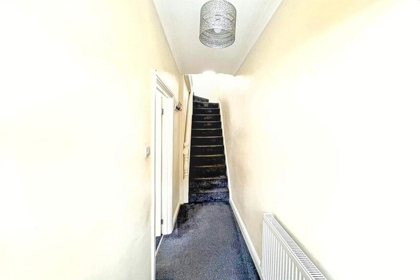 Upon entering, a hallway extends through the property, leading to the upper level via a staircase. This hallway is fitted with a radiator and features a light fixture that enhances visibility. The design of the hallway appears functional, serving as a central point that connects the various areas of the home.