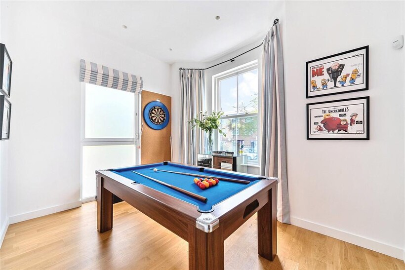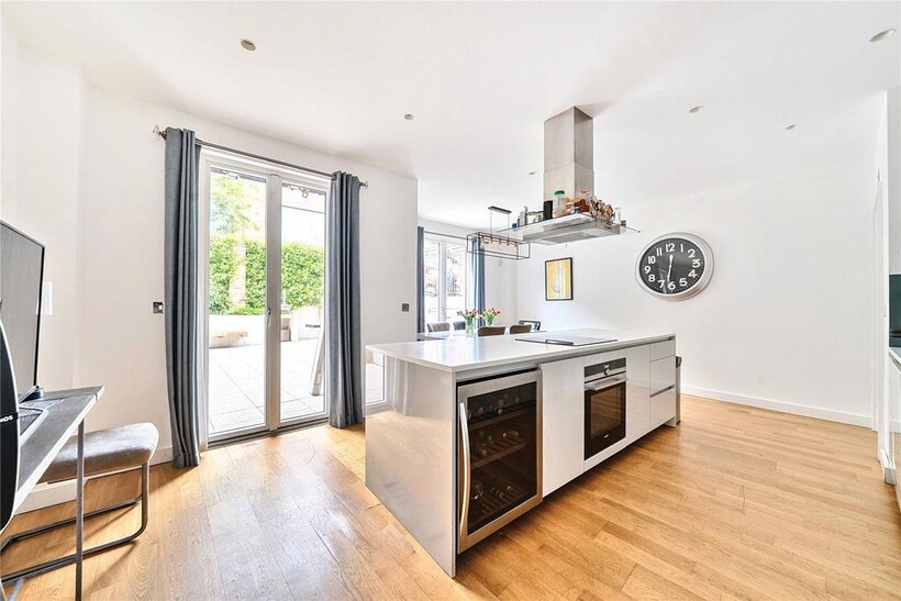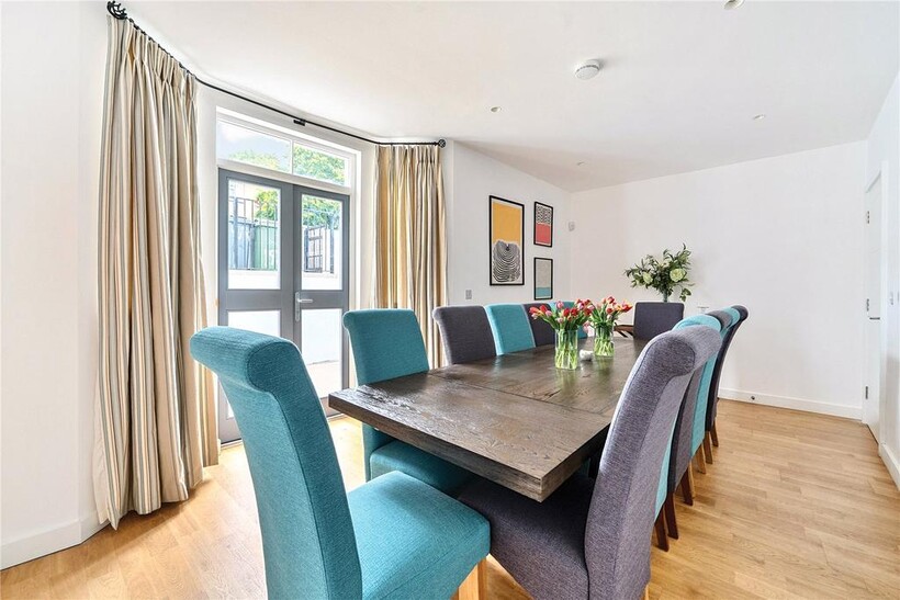 The lower ground floor hosts a stylish kitchen/dining room with integrated appliances, a central island and breakfast bar. A separate utility room leads out to the landscaped rear garden. To the front, a generous dining room opens onto a patio garden and includes a useful store room.