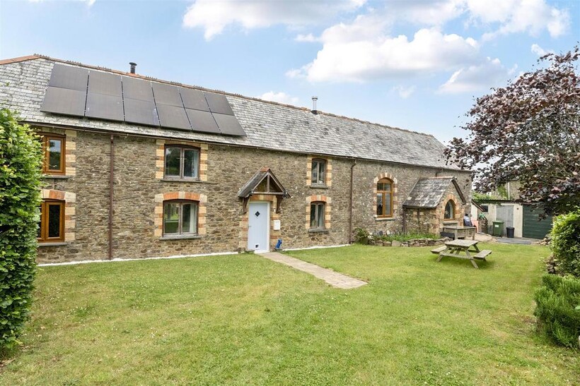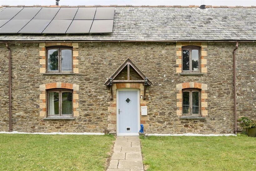Outside - Approached via a quiet private lane, the property enjoys a peaceful setting. The front garden is accessed through a five-bar gate and offers ample off-road parking, as well as a large detached garage, ideal for use as a workshop or for additional storage. The grounds are well maintained and enjoy views across open countryside. Further benefits include solar panels, an air source heat pump and private drainage, providing sustainable and energy-efficient living in a charming rural location.