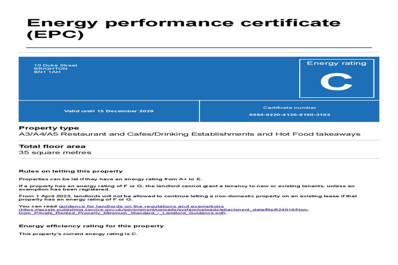 An attractive retail unit arranged over ground & first floor benefitting from E class planning consent. The unit is accessed via a door on the right hand side of the unit whilst a serving hatch is situated to the left. The first floor is approached via a staircase to the rear of the unit where a prep & storage area are located. The property also benefits from a roller shutter providing additional security. The existing tenant has the benefit of table & chairs outside in Duke Street which is by way of licence from the local authority at an additional charge.Located on the Southern side of Duke Street, a pedestrianised shopping street in Brighton's City Centre that links Brighton famous Lanes to Churchill Square Shopping Centre. Brighton Mainline Station & Brighton Seafront are a short walk away whilst nearby occupiers in include Offspring, Montezuma's Chocolate, Nandos, The Ivy & The Ivy Asia, Pizza Pilgrims, Nationwide Building Society, Flat Iron & Honest Burger along with a number of impressive independent occupiers also nearby.
